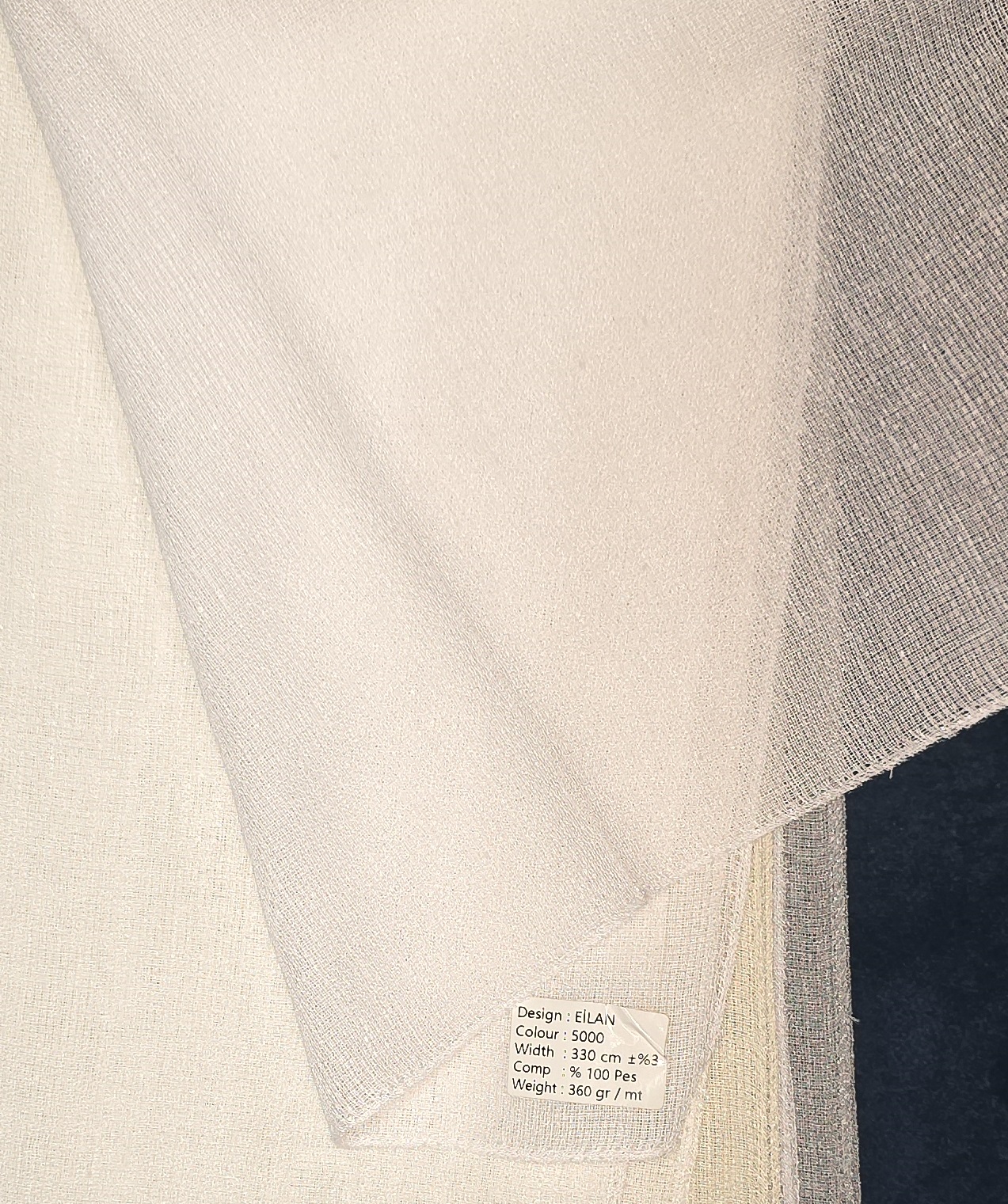 Высокая плотность 360 г/м² — это один из самых плотных тюлей на рынке. Он практически не просвечивает, мягко рассеивает солнечный свет, создавая камерную, защищённую атмосферу. При этом ткань остаётся достаточно пластичной для красивых волн и складок.